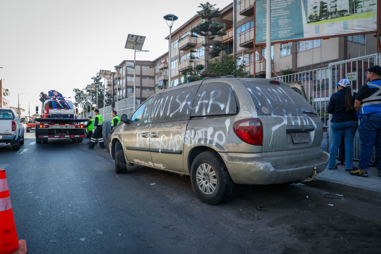 "Muni sacar" era el graffiti en un vehículo abandonado que fue retirado por personal de la Municipalidad de Antofagasta, que estaba en plena avenida Valdivia y causando una serie de problemas entre los vecinos, debido a que era utilizado por una persona en situación de calle que consumía alcohol e incurría en una serie de desórdenes.