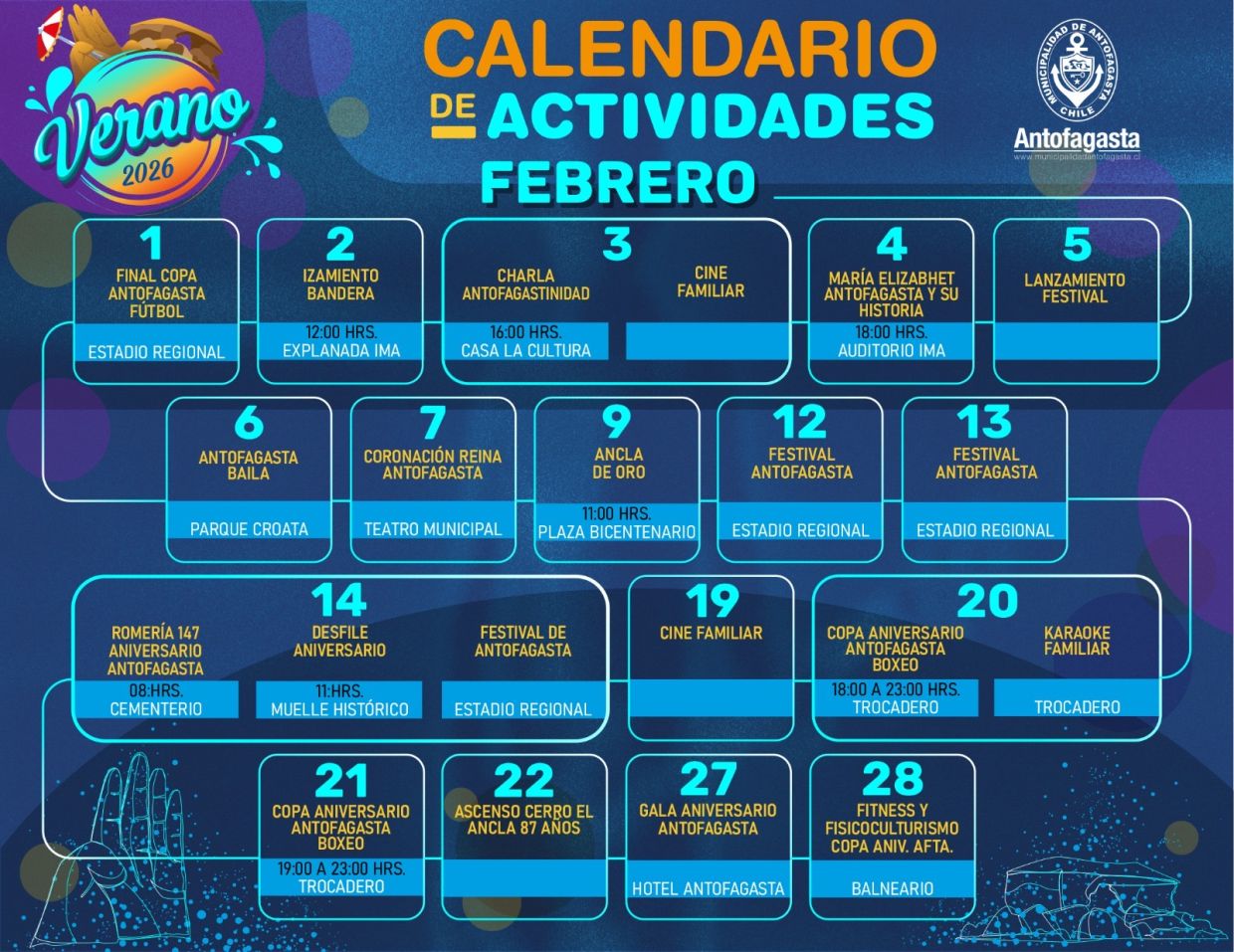 Con una variada programación que se desarrollará entre enero y fines de febrero, la Municipalidad de Antofagasta presentó el calendario oficial de actividades Verano 2026, iniciativas que contempla panoramas gratuitos y familiares en cultura, deporte, recreación y promoción de la salud, tanto para la comunidad local como para quienes visiten la ciudad.