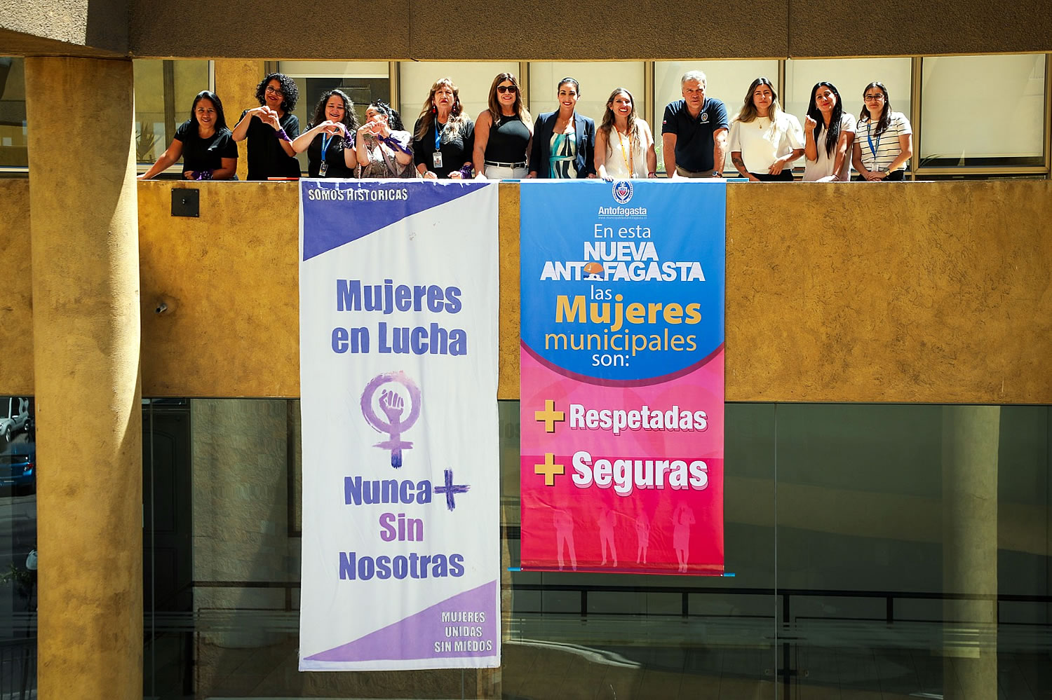 La Municipalidad de Antofagasta junto a la Agrupación "Mujeres Unidas sin Miedo" desplegaron dos lienzos en el marco de la conmemoración del Día de la Mujer que se llevó a cabo en el gobierno comunal, junto con una actividad de reflexión y reconocimiento a funcionarias del municipio.